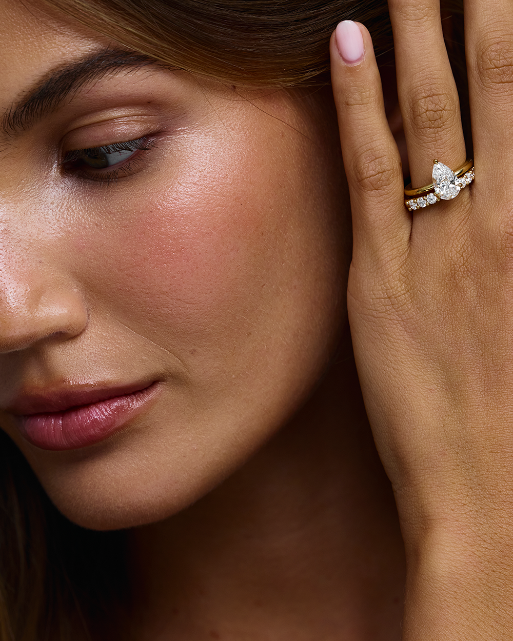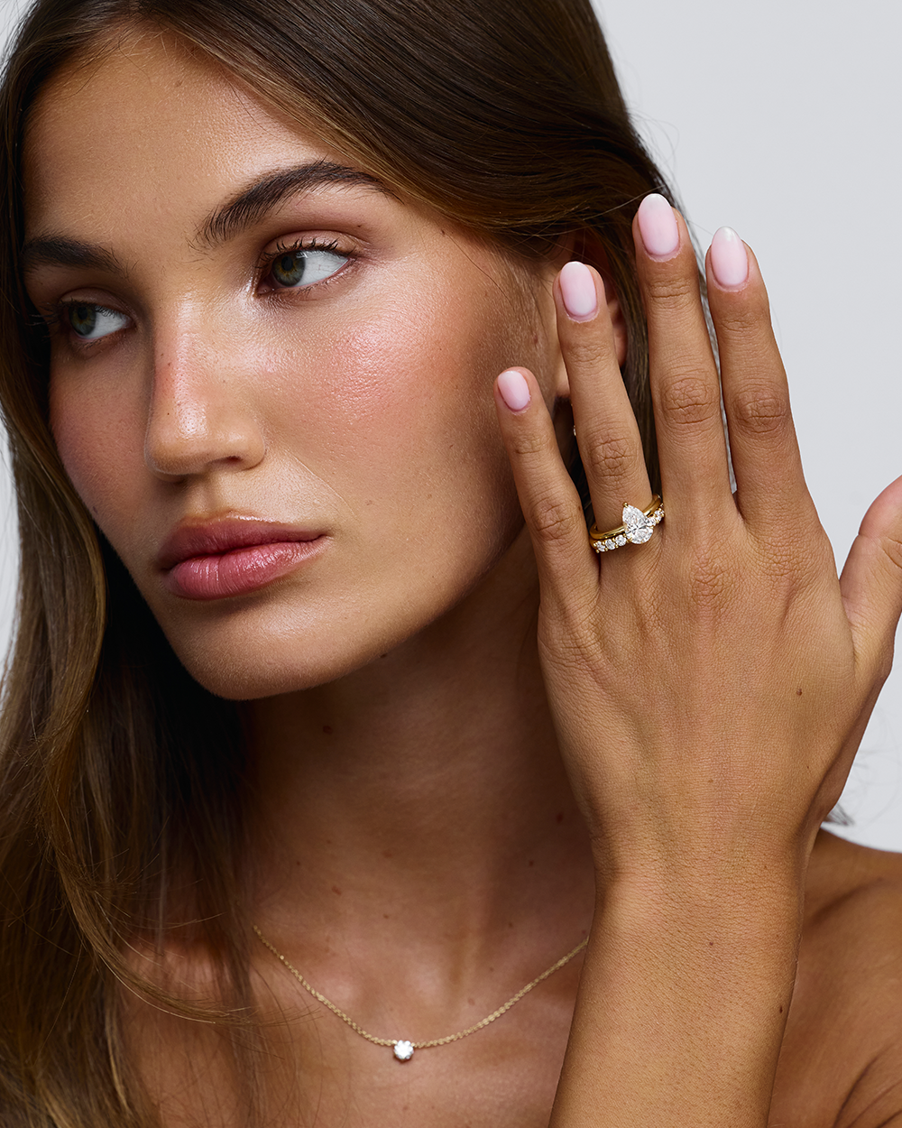 Erin features an exquisite 2.05ct pear-shaped lab grown diamond, beautifully set in a refined four-claw design. The elegant silhouette of the pear cut brings a graceful balance of brilliance and softness, while the warmth of 18ct yellow gold enhances its timeless appeal. Simple yet sophisticated, Erin is a design created to embody love in its purest form.