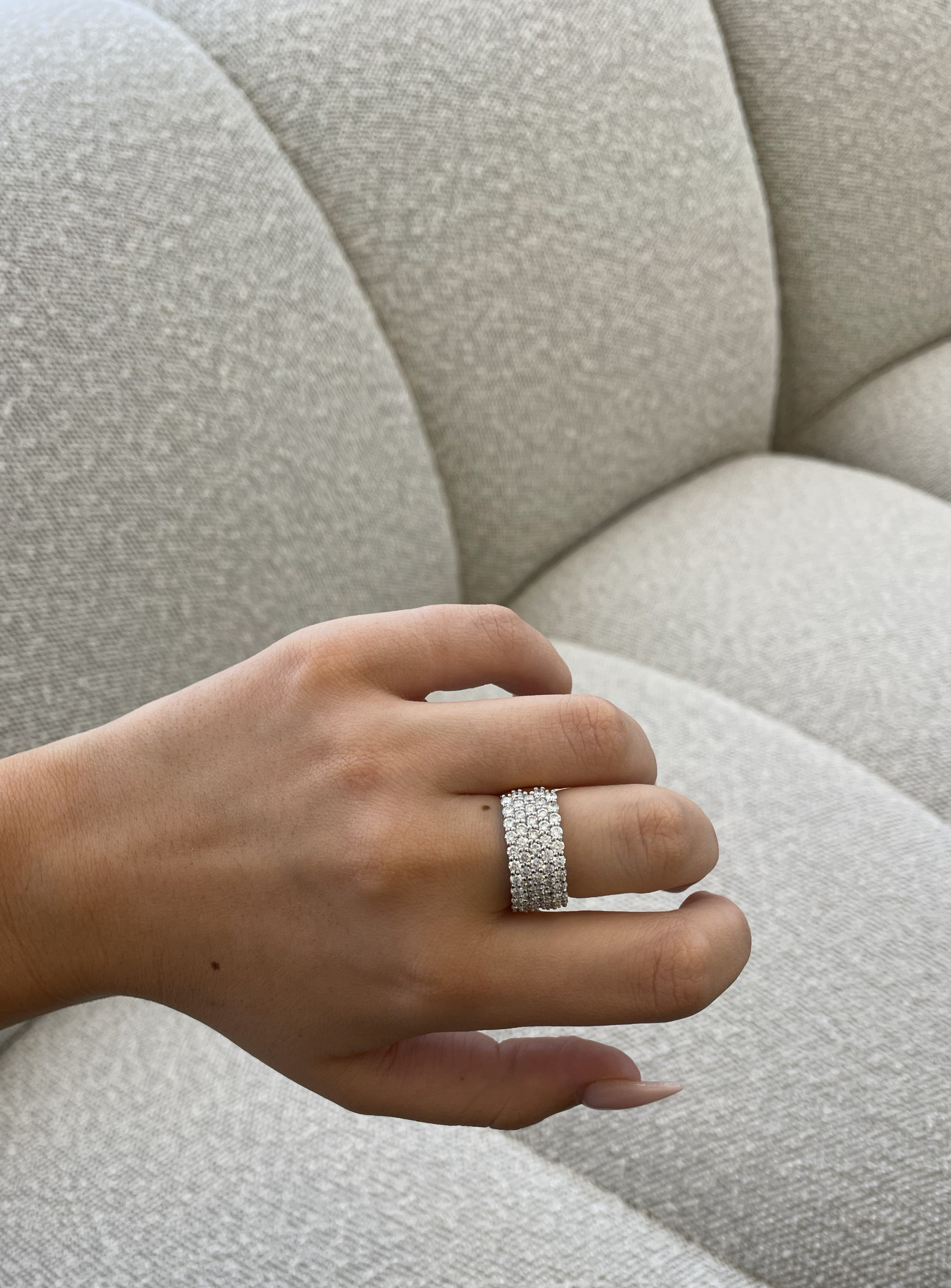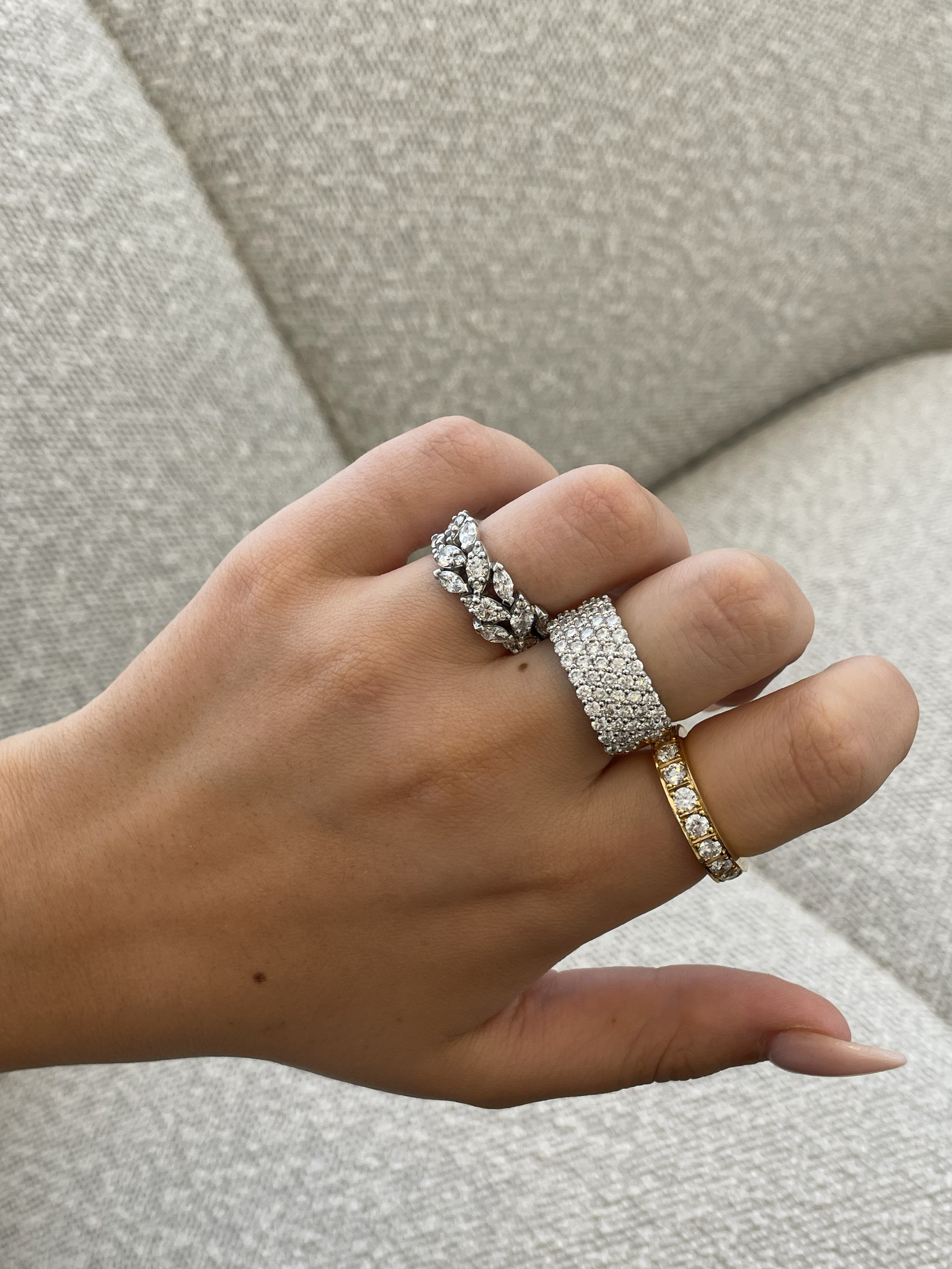 Designed to dazzle, the Bold Diamond Band is crafted with five rows of shimmering natural diamonds set in an 18ct white gold top and finished with a contrasting 18ct yellow gold band. With 52 hand-set diamonds totalling over two carats, this piece makes an unforgettable statement. Complimentary resizing.