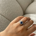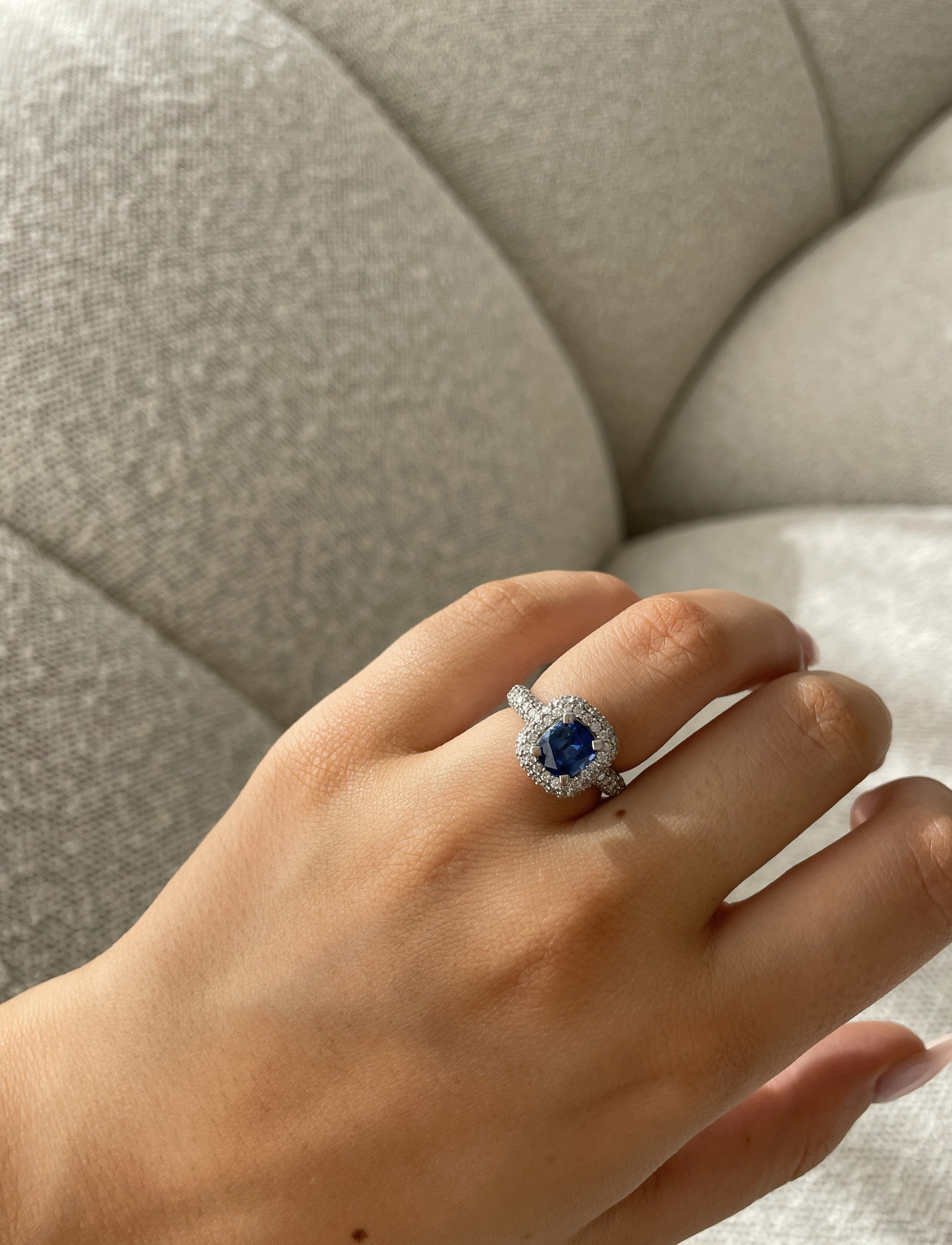 A bold yet elegant piece, this 18ct white gold ring features a stunning 1.51ct cushion-cut Ceylon sapphire, claw-set to highlight its vibrant hue. Surrounded by a dazzling array of 106 natural round brilliant cut diamonds in a pavé setting, this ring is a luxurious statement of refined beauty and exceptional craftsmanship.