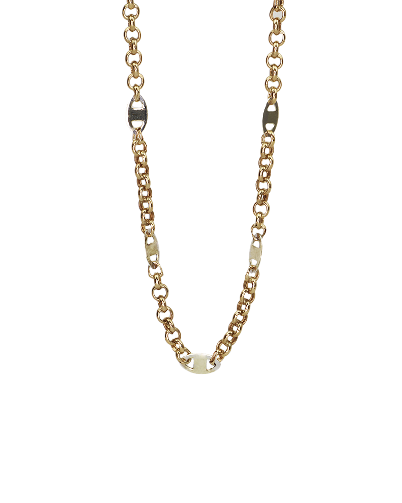 Add a touch of elevated detail to your everyday look with this 9ct yellow and white gold fancy belcher chain. Its alternating tones and intricate links offer a unique take on a classic style ideal for layering or wearing solo.