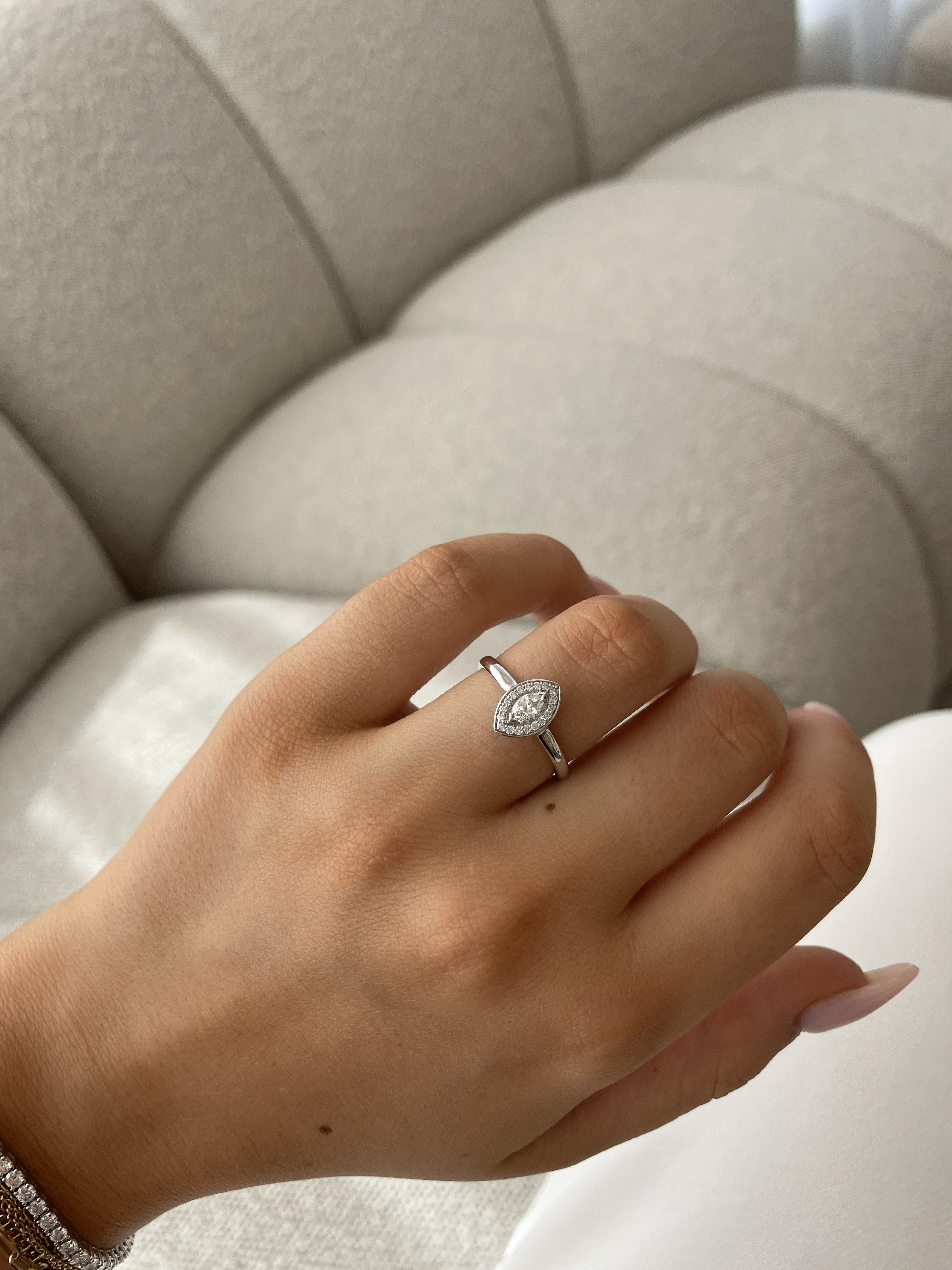 A refined and striking piece, this 18ct white gold ring features a marquise-cut natural diamond as its centrepiece, elegantly set in a secure claw setting. Accentuated by 18 round brilliant natural diamonds, the design offers timeless sophistication with a modern twist. A polished band completes the look, making it a perfect addition to your fine jewellery collection.