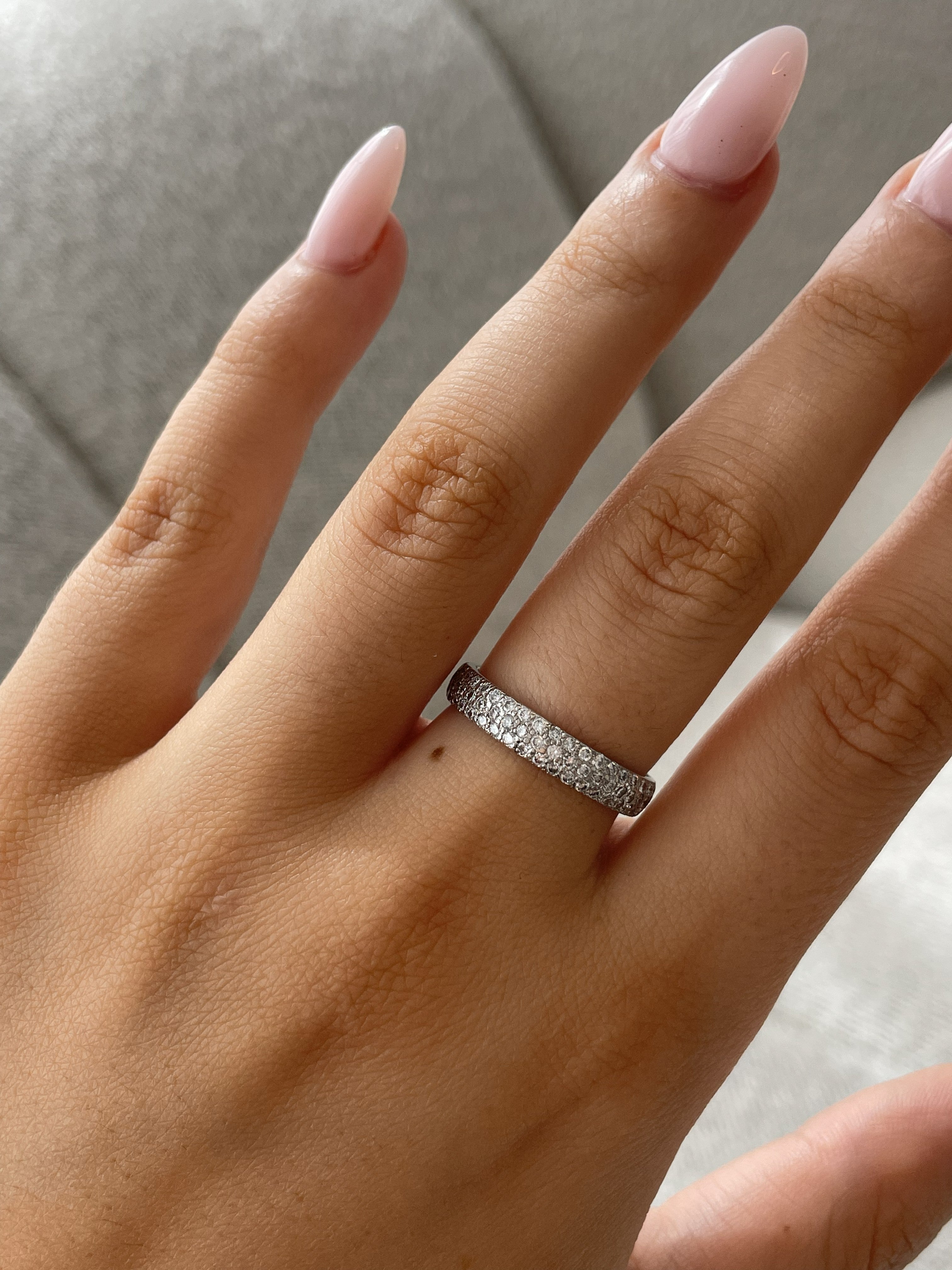 Delicate and timeless, this platinum diamond band is intricately pavé set with 59 round brilliant cut natural diamonds, offering a continuous shimmer of refined sparkle. With its slim profile and elegant finish, this ring is perfect for stacking, pairing with an engagement ring, or wearing as a sophisticated standalone piece.