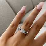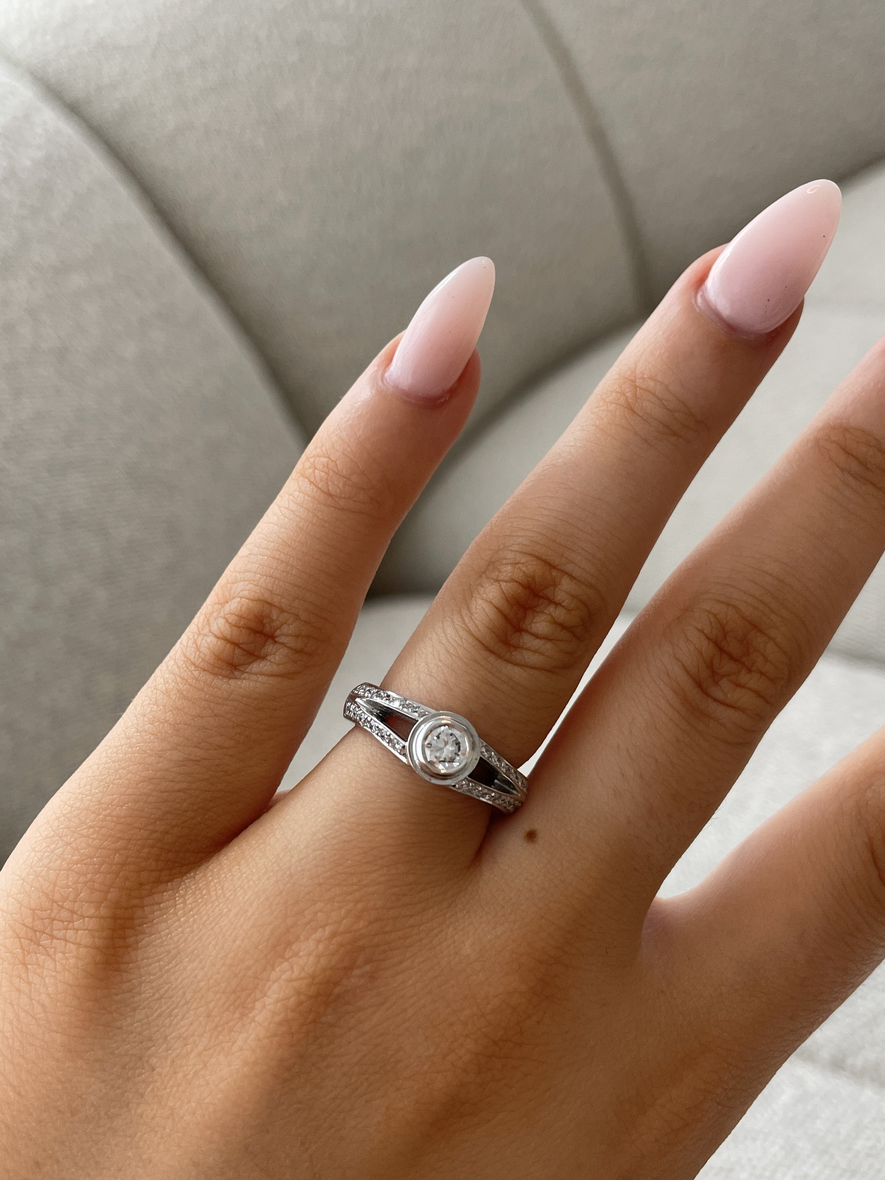 Showcasing a striking balance of bold and refined, this 18ct white gold ring features a 0.40ct round brilliant natural diamond (F/E colour, VS clarity) in a contemporary bezel setting. Accentuated by 28 round brilliant cut diamonds (G SI2) delicately bead set along the split band, this design captures elegance from every angle. A sophisticated choice for those who appreciate detail and brilliance.