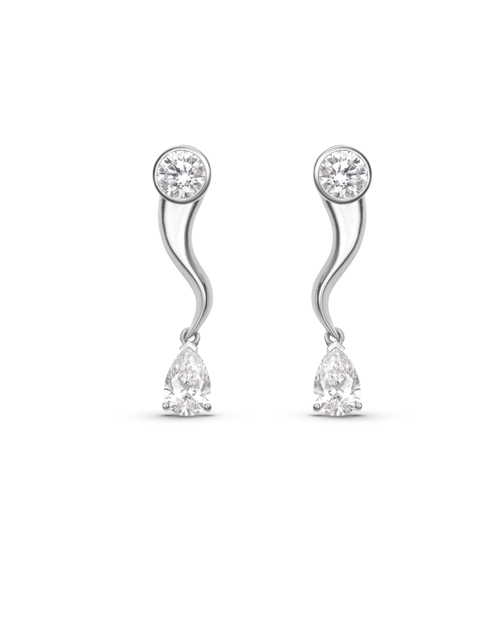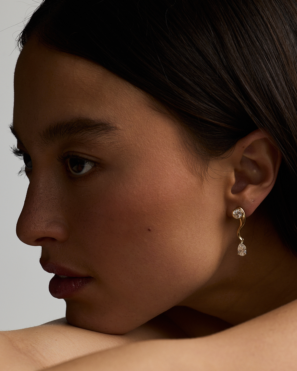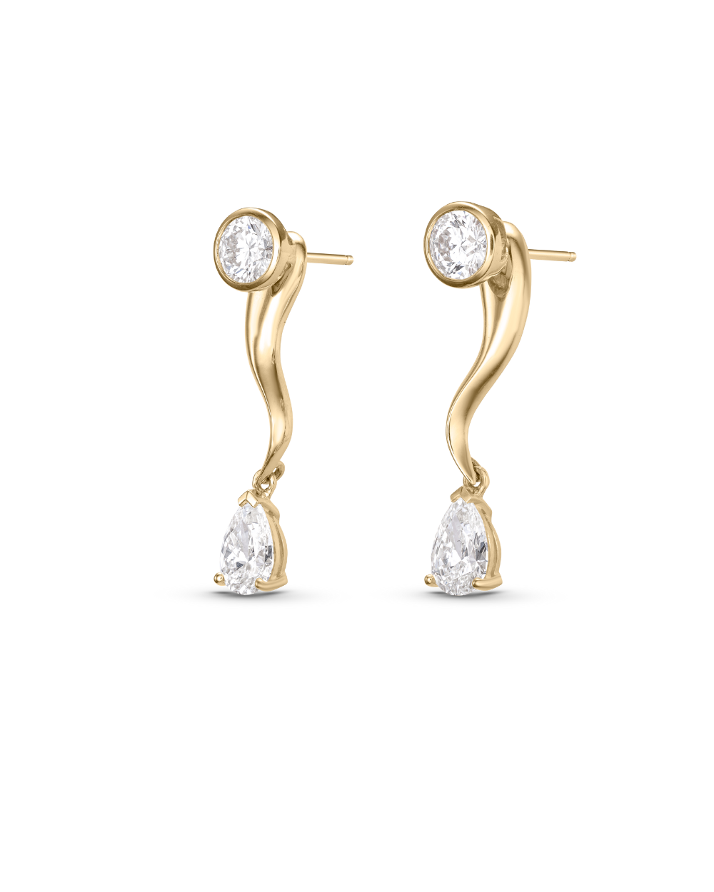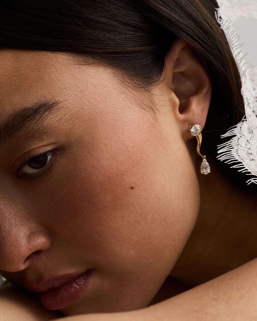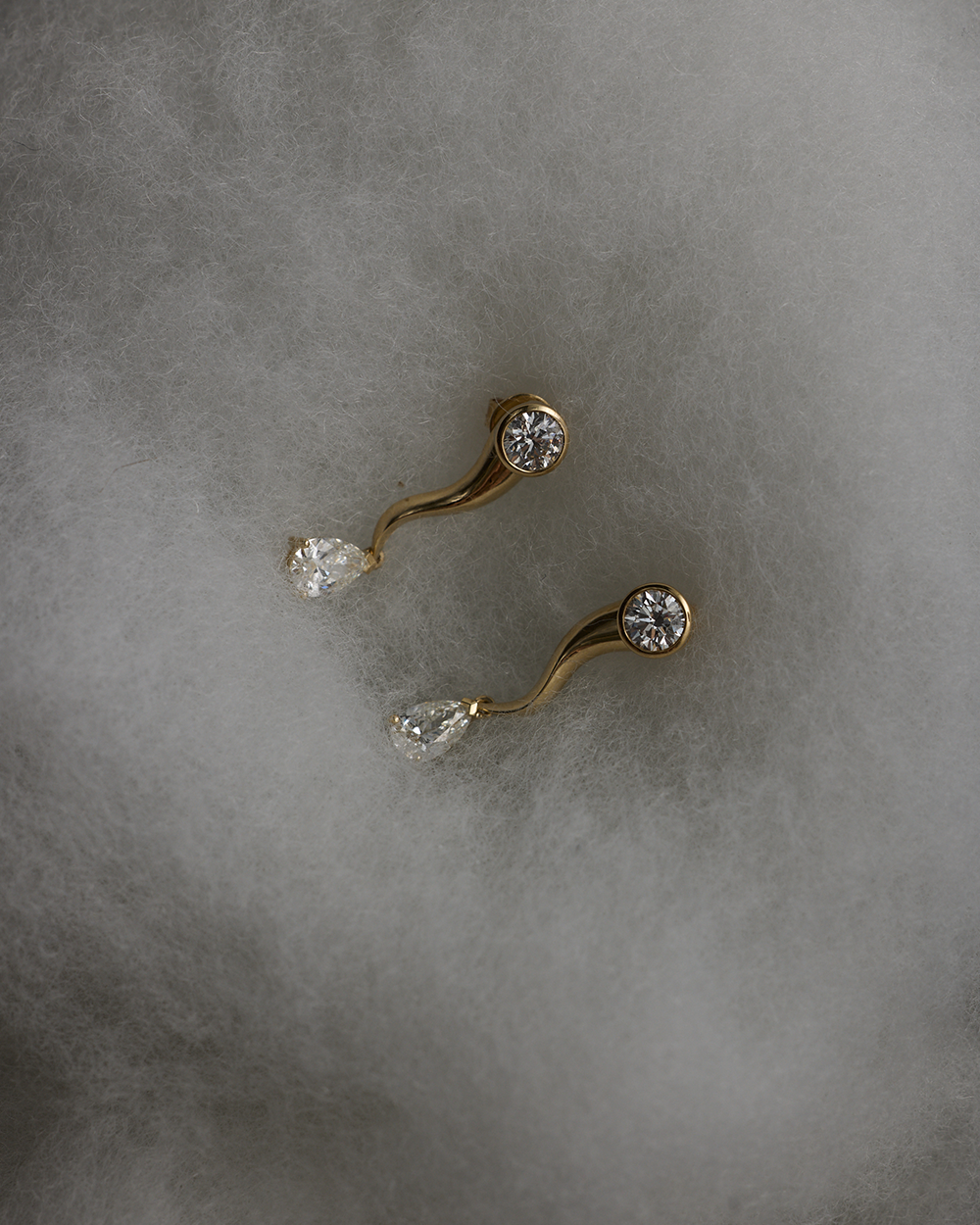 Transform your classic studs into a sculptural statement with our Vienna Diamond Jackets. Crafted in 9ct yellow gold, each jacket curves softly beneath the lobe before finishing in a brilliant pear lab grown diamond, creating a fluid, modern drop. Paired in the image with our round bezel set stud which sits above the jacket for a contemporary contrast. The Vienna is designed to attach seamlessly to our claw or bezel diamond studs, offering an elegant way to shift your look from pared back to elevated.