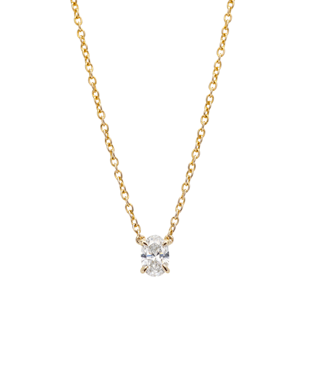 Discover everyday luxury with our Oval Solitaire Diamond Necklace. Featuring a dazzling oval-cut natural diamond, this timeless piece is set on a delicate 9ct gold chain, designed to sit elegantly against your neckline. Perfect for adding a touch of brilliance to your daily look or as a sophisticated accent for special occasions.
