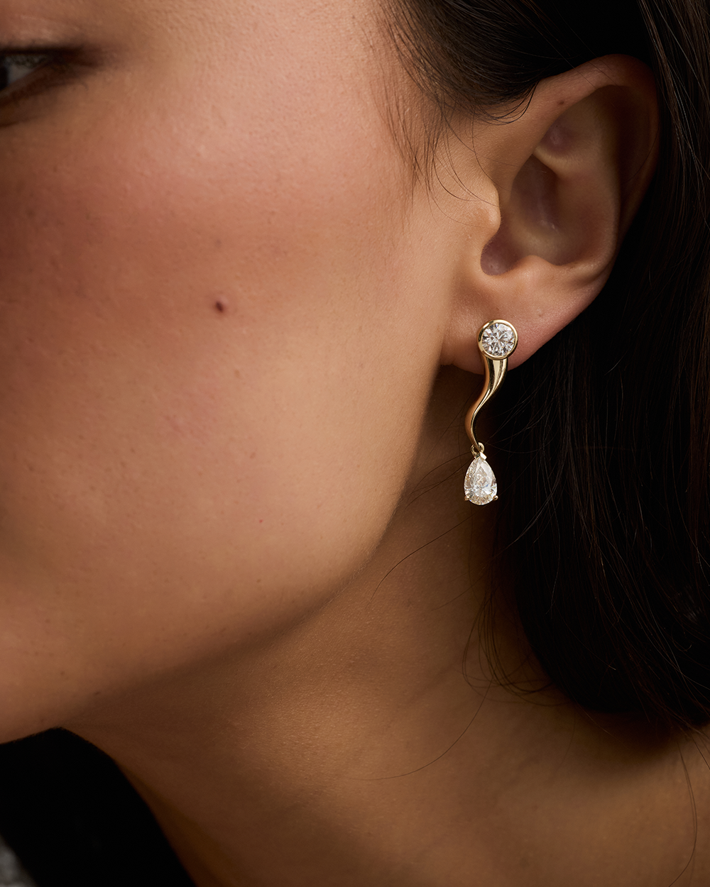 Transform your classic studs into a sculptural statement with our Vienna Diamond Jackets. Crafted in 9ct yellow gold, each jacket curves softly beneath the lobe before finishing in a brilliant pear lab grown diamond, creating a fluid, modern drop. Paired in the image with our round bezel set stud which sits above the jacket for a contemporary contrast. The Vienna is designed to attach seamlessly to our claw or bezel diamond studs, offering an elegant way to shift your look from pared back to elevated.