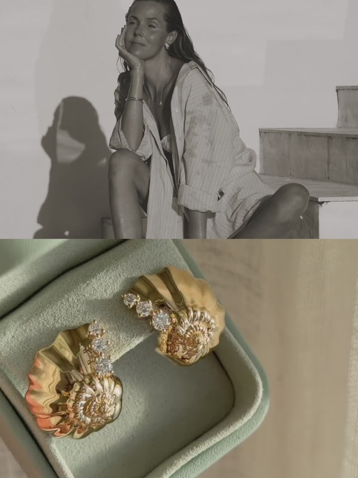 Fredrika Akander wears the Ariel Shell Earrings and Azzure Necklace, two limited edition designs inspired by the fluid beauty of the Australian coastline. Sculptural yet refined, the Azzure Necklace curves in gold and is set with graduating lab grown diamonds that catch the light with every movement, while the Ariel Shell Earrings balance organic texture with delicate sparkle. Contemporary, collectible and designed to be cherished for years to come.