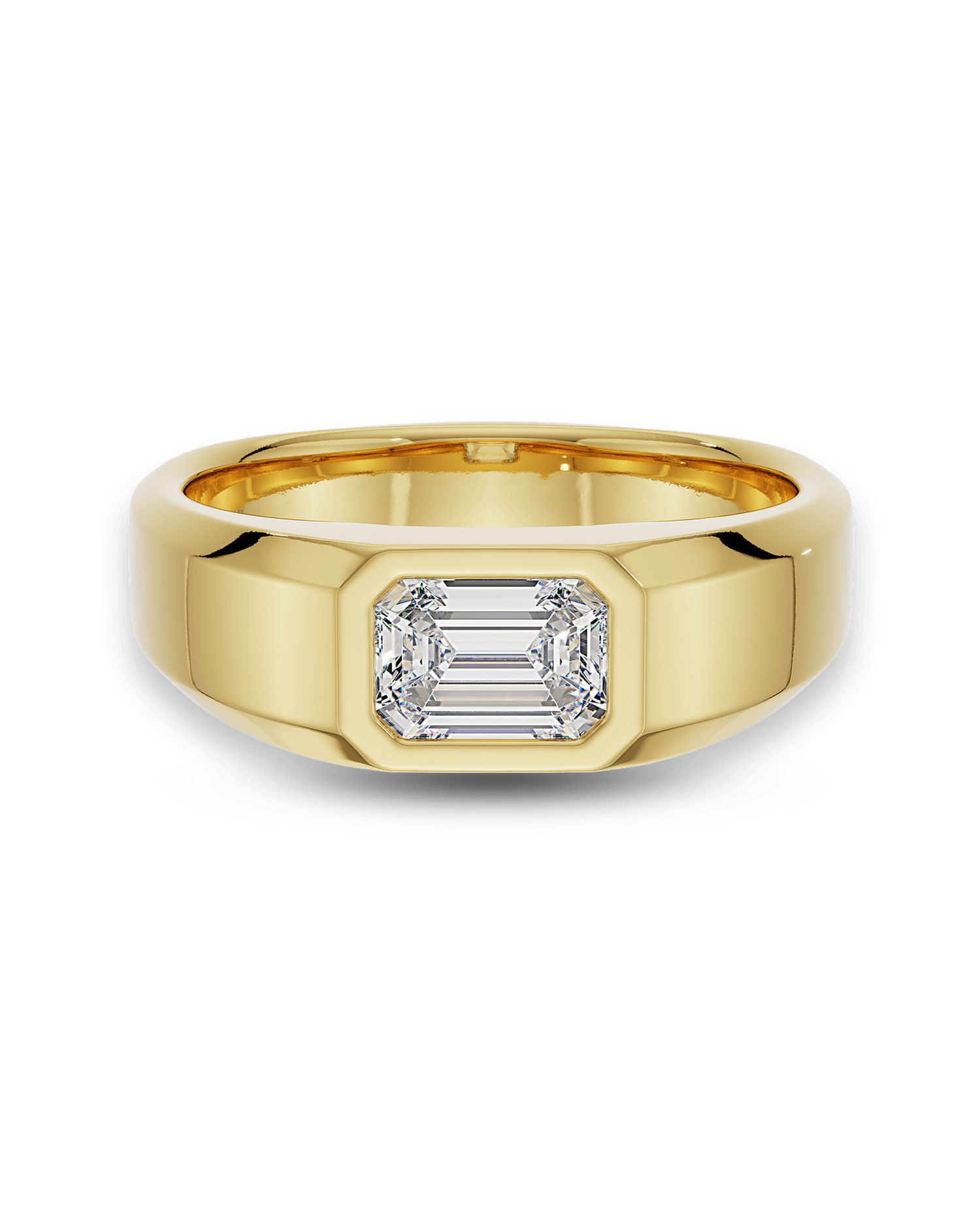 Marking a daring new chapter of love, the unisex Dylan Ring showcases the striking beauty of an emerald-cut diamond. Set within a bold band featuring clean lines and a refined bevelled edge, Dylan redefines tradition with strength and sophistication.