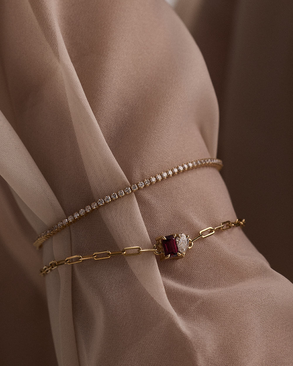 The Bridget Toi Et Moi Bracelet is a contemporary expression of timeless elegance. Featuring your choice of a emerald cut gemstone paired with a sleek 0.30ct pear diamond, this refined duo is seamlessly set along a solid 9ct gold paperclip chain. Effortlessly balancing sophistication and wearability, it’s a bold yet versatile piece made for everyday elegance.
