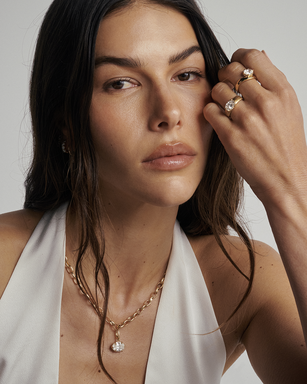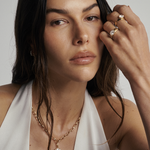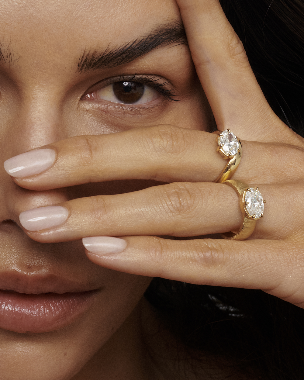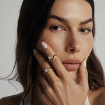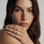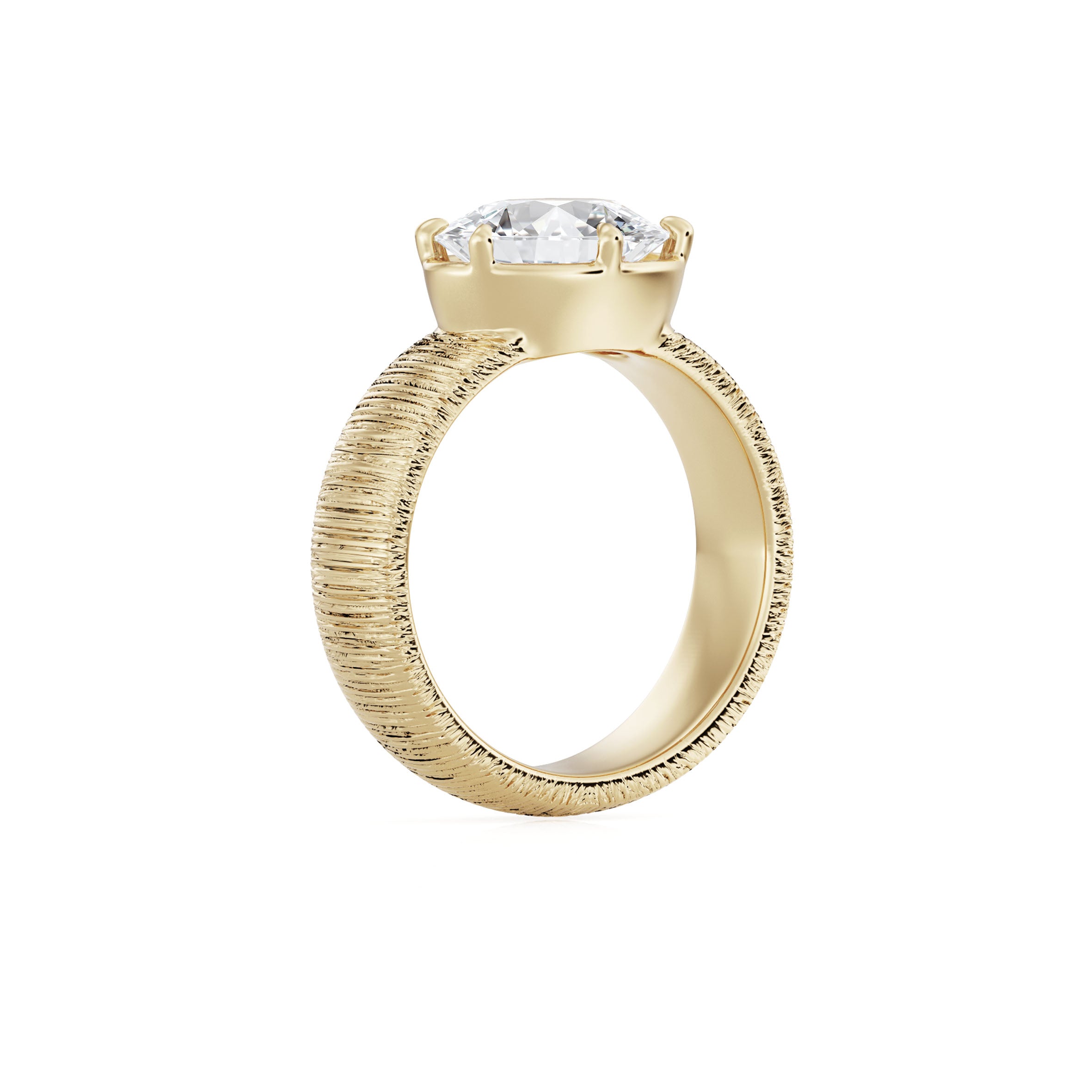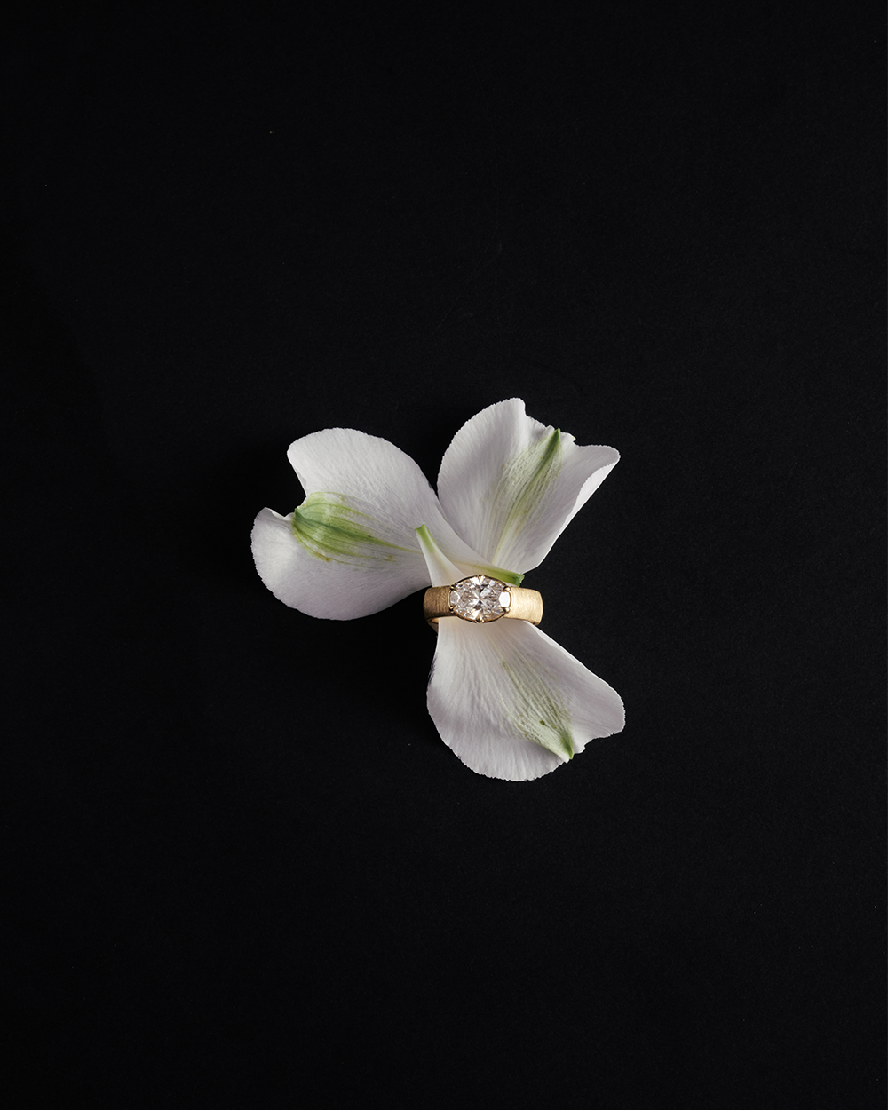The Alba Ring brings together understated texture and bold design. Its wide brushed gold band gives the piece a refined, organic feel, creating a perfect contrast to the brilliance of the central diamond. Set in an east–west orientation, the oval diamond feels modern and unexpected, stretching elegantly across the finger for a striking silhouette.