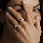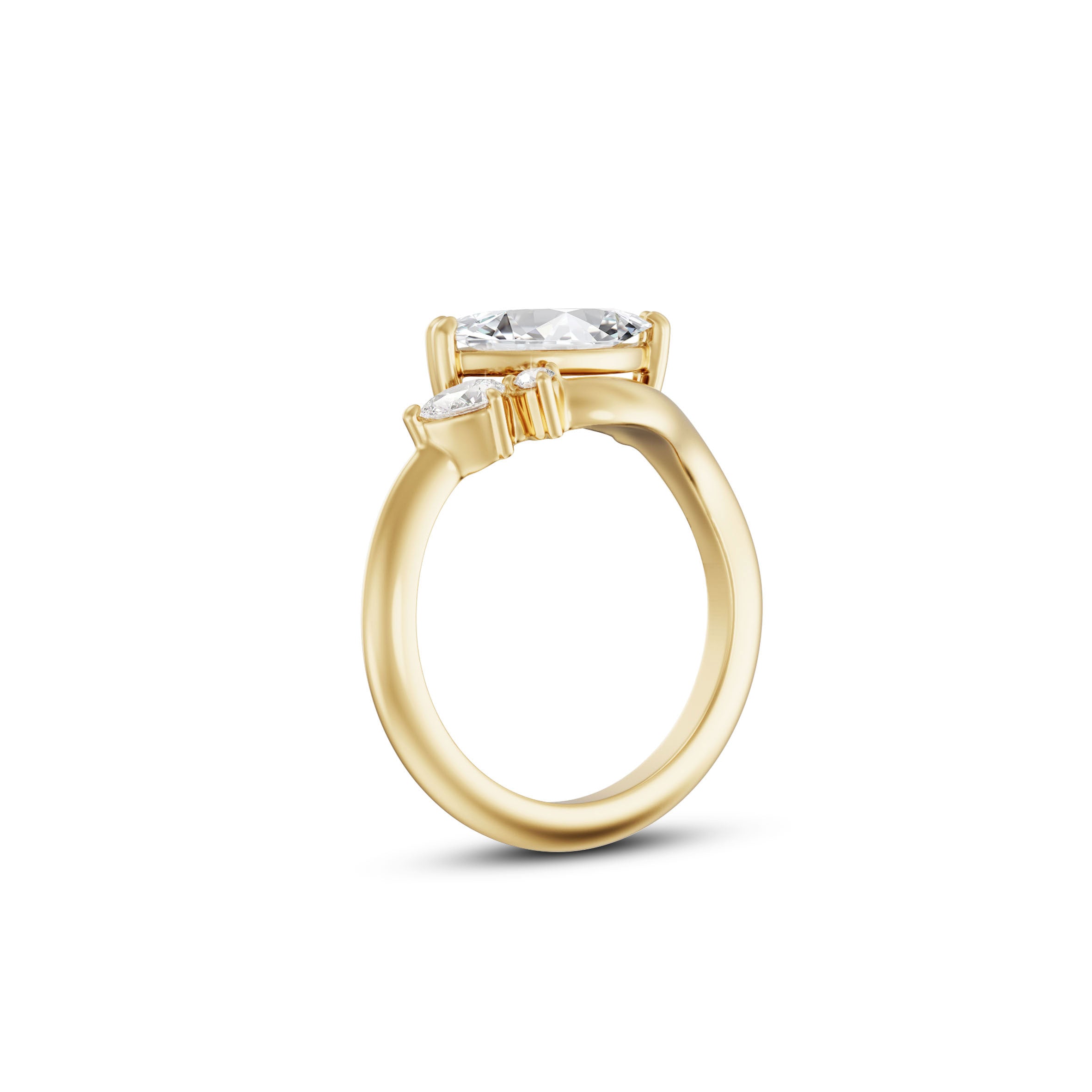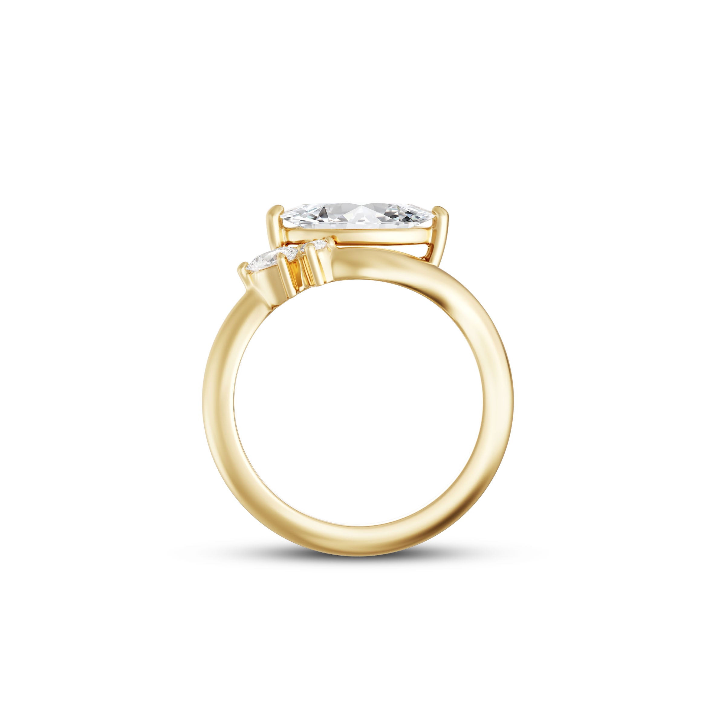 The Ayla Ring is a delicate yet striking design that plays with flow and form. A marquise cut diamond, set east–west across the finger, creates a sleek and contemporary silhouette. Its brilliance is enhanced by pear and round diamond accent on the band, adding a touch of asymmetry and sparkle that feels modern and effortless.