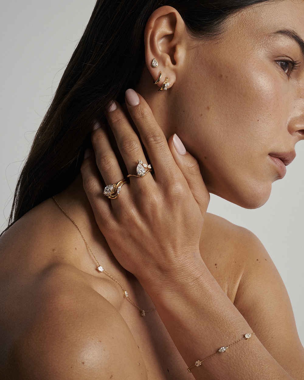 The Yasmin Ring is a graceful celebration of movement and light. A pear cut diamond rests at the heart of the design, its brilliance accentuated by three smaller pear cut diamonds that rise alongside it in a delicate flourish. The curved yellow gold band enhances the flowing silhouette, giving the impression of petals unfolding or wings in flight.