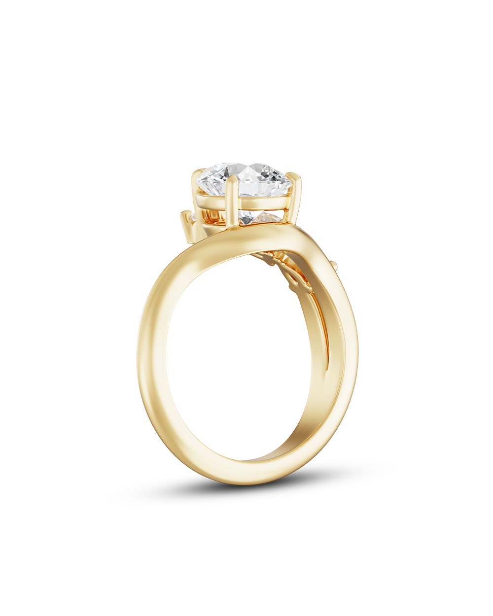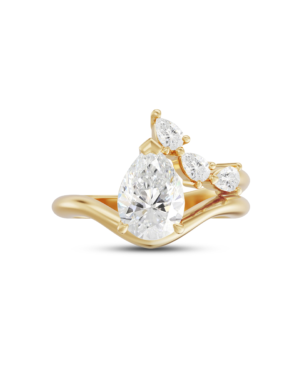 The Yasmin Ring is a graceful celebration of movement and light. A pear cut diamond rests at the heart of the design, its brilliance accentuated by three smaller pear cut diamonds that rise alongside it in a delicate flourish. The curved yellow gold band enhances the flowing silhouette, giving the impression of petals unfolding or wings in flight.