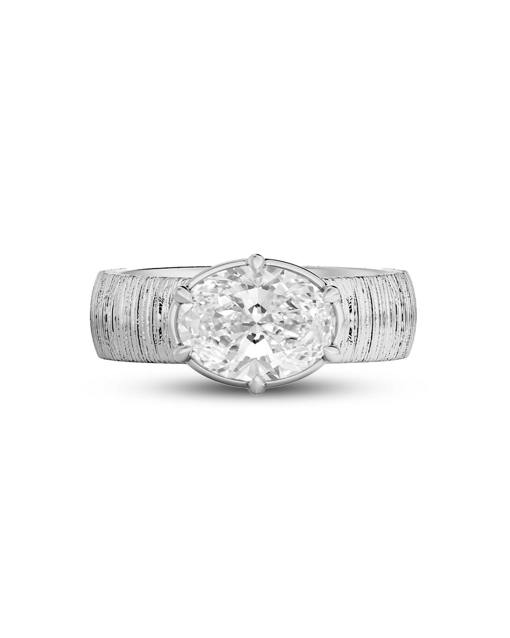 The Alba Ring brings together understated texture and bold design. A wide brushed gold band gives the piece a refined, organic feel, creating the perfect contrast to the brilliance of the central diamond. Set in an east–west orientation, the oval cut diamond feels modern and unexpected, stretching elegantly across the finger for a striking silhouette.