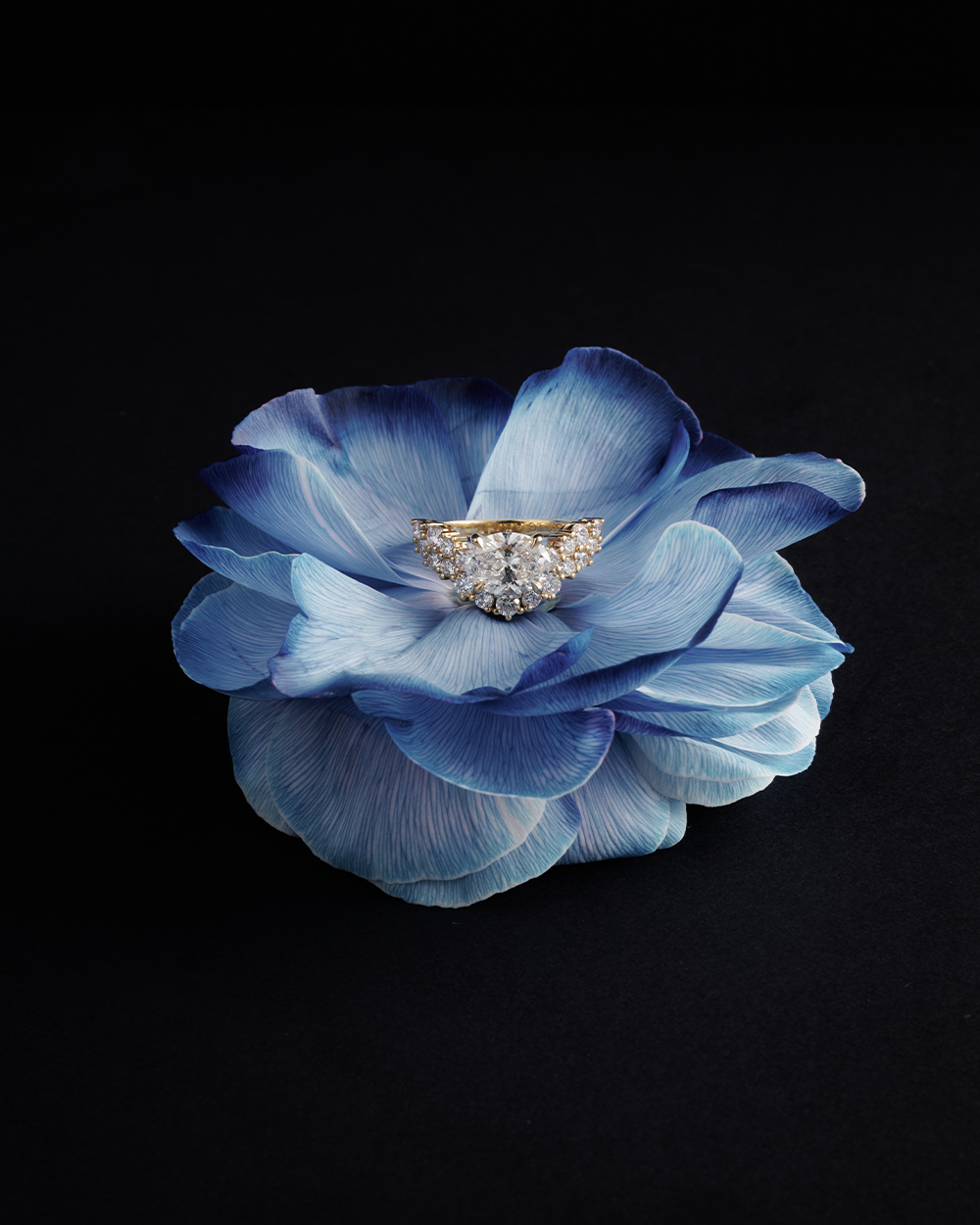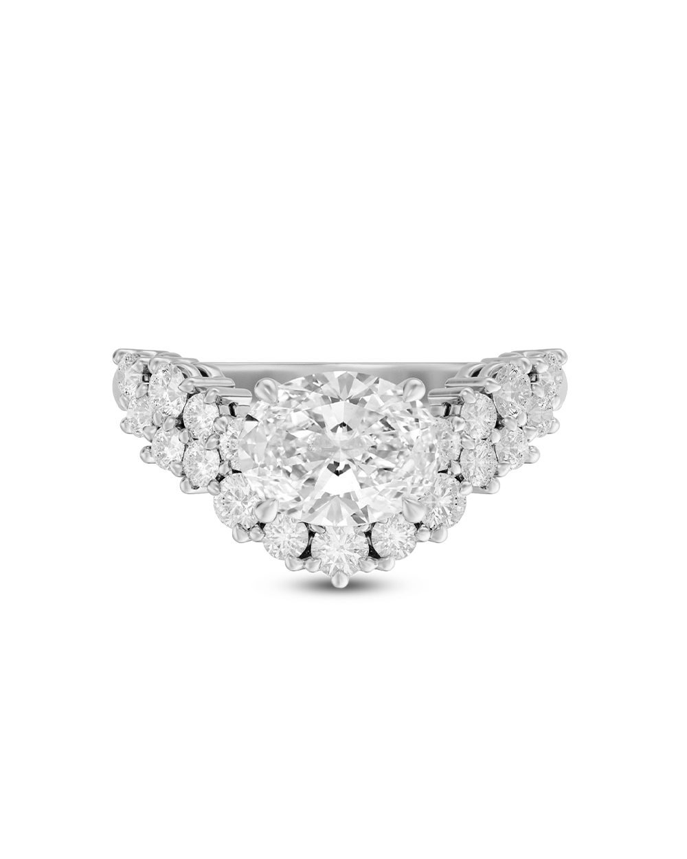 Radiant and full of light, the Estelle Ring is a true showstopper. At its heart, a brilliant east west oval cut diamond is framed by a constellation of round diamonds that sweep gracefully along the curved band. Like starlight reflecting on still water, every angle of this design sparkles with luminous brilliance.