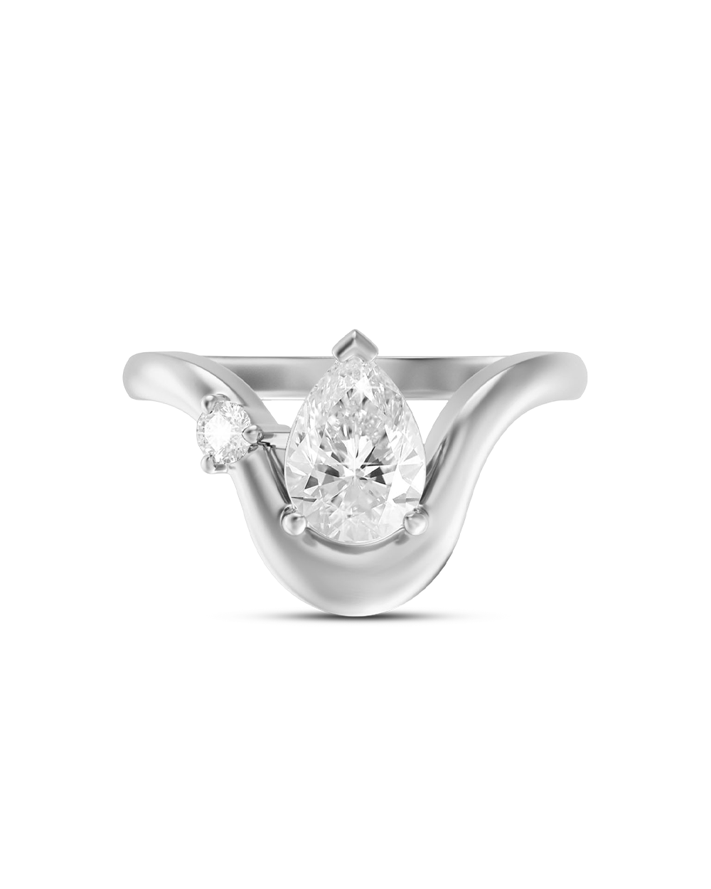 Drawing inspiration from mythology, the Helena is a symbol of beauty and devotion. At its heart rests a graceful pear cut diamond, embraced by a curved gold band that flows like a swan’s wings in motion. A single round brilliant diamond accents the band, adding a delicate sparkle to enhance the elegance of the central stone.
