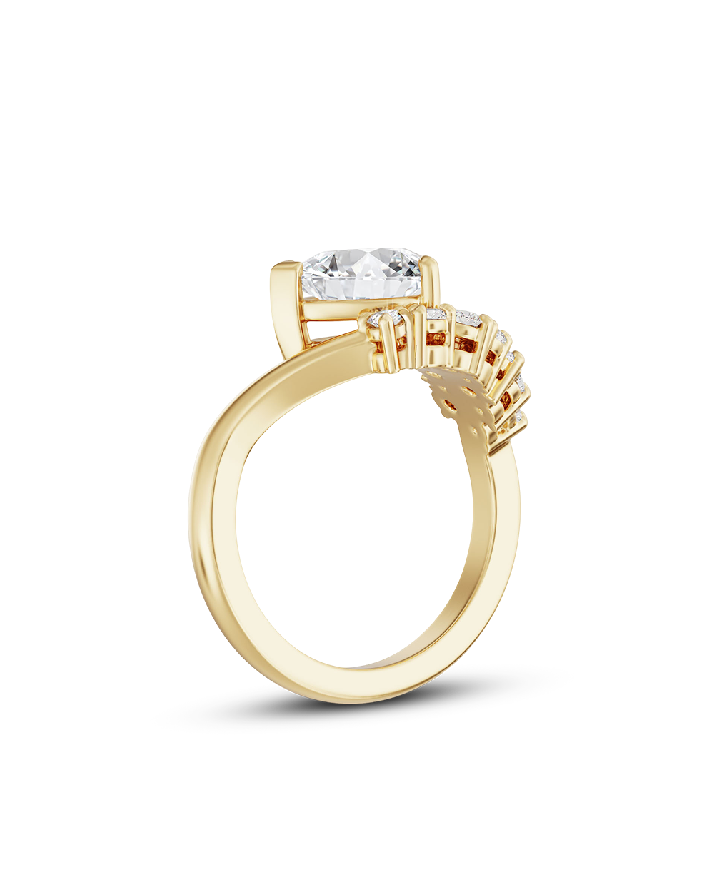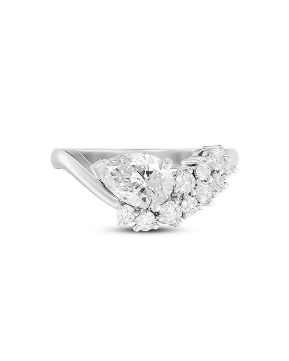 The Juliette Ring is a celebration of romance, radiance, and timeless beauty. A graceful pear cut diamond takes centre stage, its brilliance enhanced by a cluster of round diamonds that sweep elegantly along the band in a sparkling flourish. The design feels like poetry in motion luminous, expressive, and unforgettable.