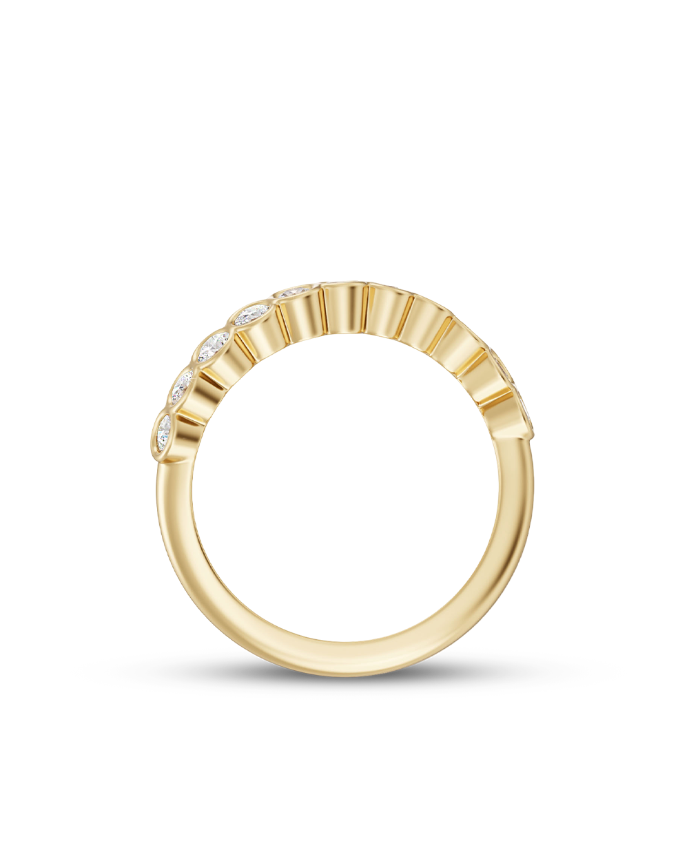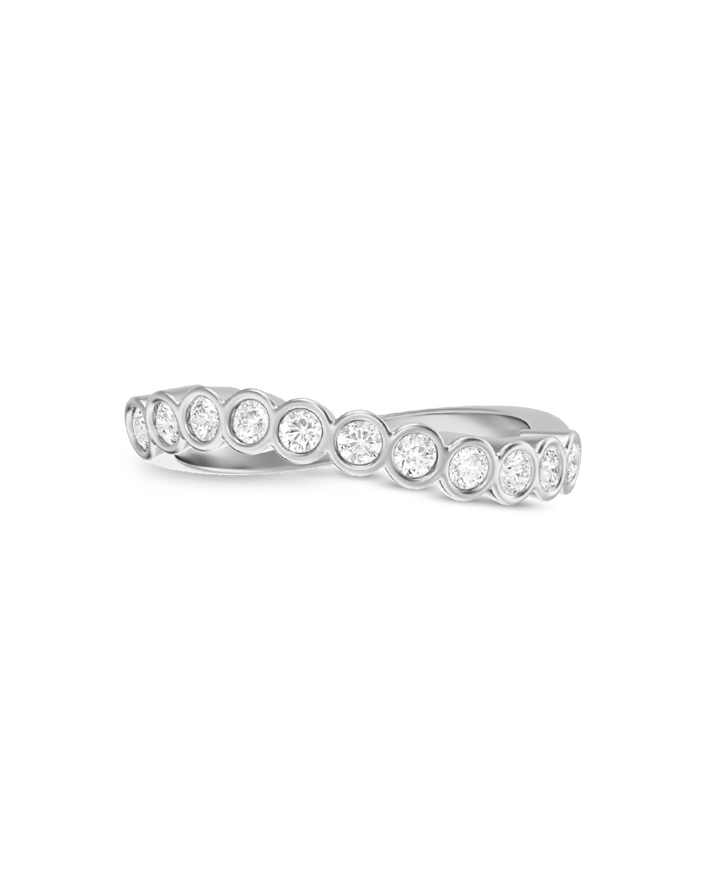 The Muse Wedding Band is crafted with a gentle curved silhouette to pair beautifully with the Muse Engagement Ring. A row of brilliant round lab grown diamonds in sleek bezel settings brings a modern touch of sparkle, while the curved design ensures a seamless fit.