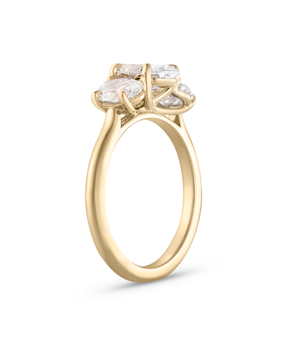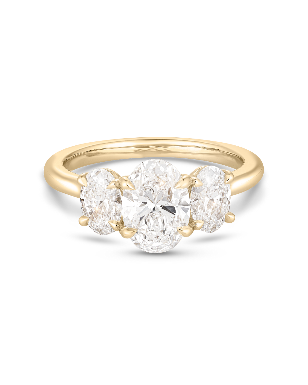 The Stella Trilogy Engagement Ring is a breathtaking celebration of love’s past, present, and future. At its heart lies a 2.01ct oval cut lab grown diamond of D colour and VS1 clarity, flanked by two perfectly matched 1.02ct oval-cut diamonds of the same exceptional grade. Each stone is held in a refined claw setting, allowing light to flow effortlessly through and enhance their brilliance. Crafted in radiant 18ct yellow gold, Stella’s elegant symmetry and graceful proportions make it a timeless expression of enduring love.