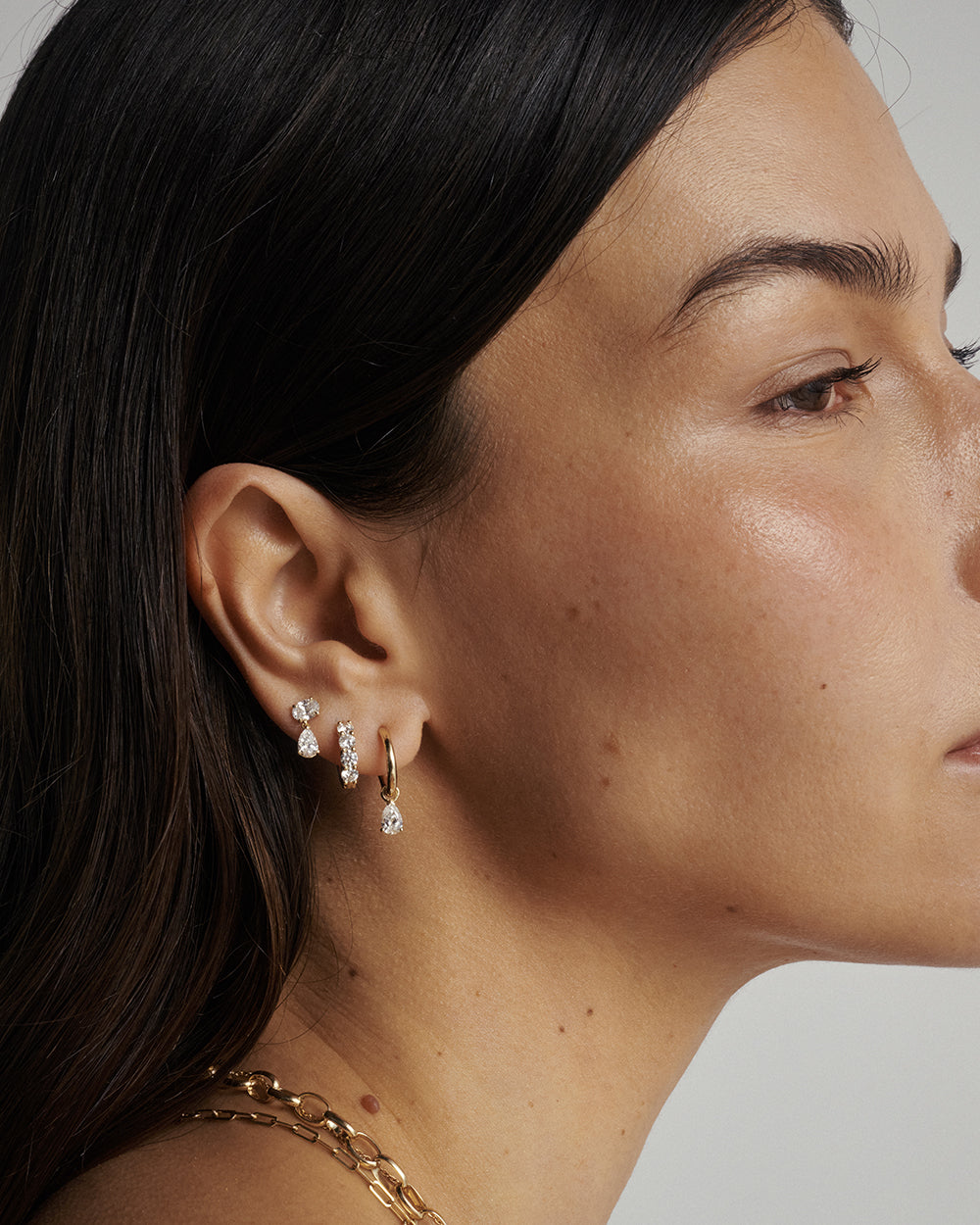 As seen on Jess Dover, our personalised ear styling appointments are designed to help you curate a look that feels uniquely your own. During your session, our expert team will guide you through a selection of studs, hoops and huggies, showing you how different shapes and sizes can be layered to complement your features and personal style.